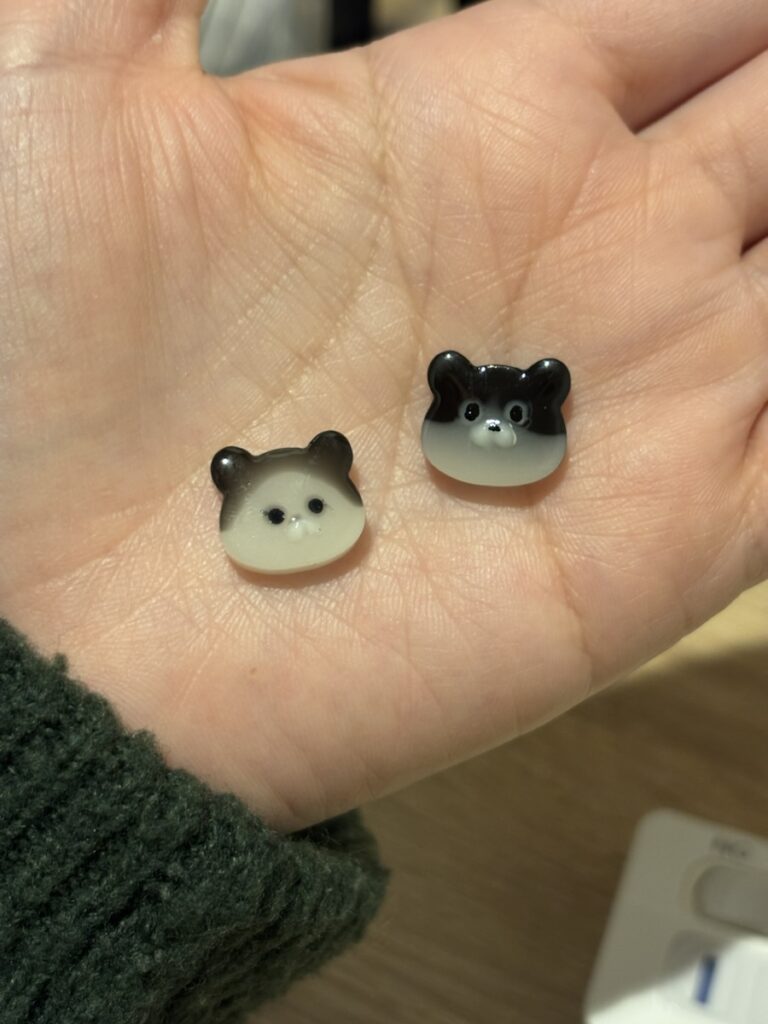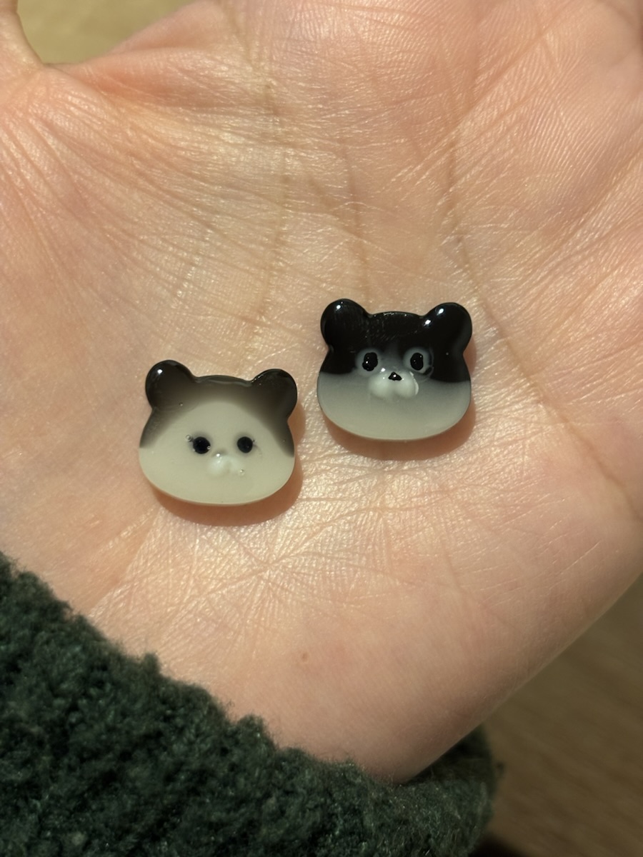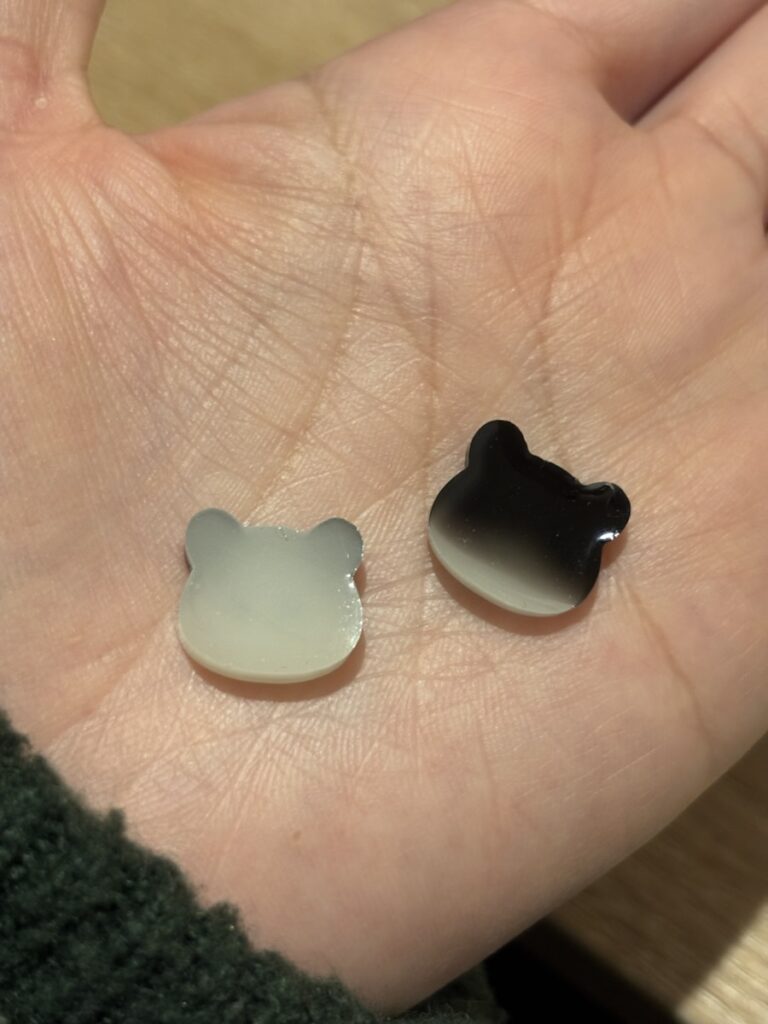 あと、目の色がはっきりしないので、昨日たくさん作った目にマジックで着色して、それを封入したんですが、レジン液で少しインクが溶けてしまったのか滲んでいます。