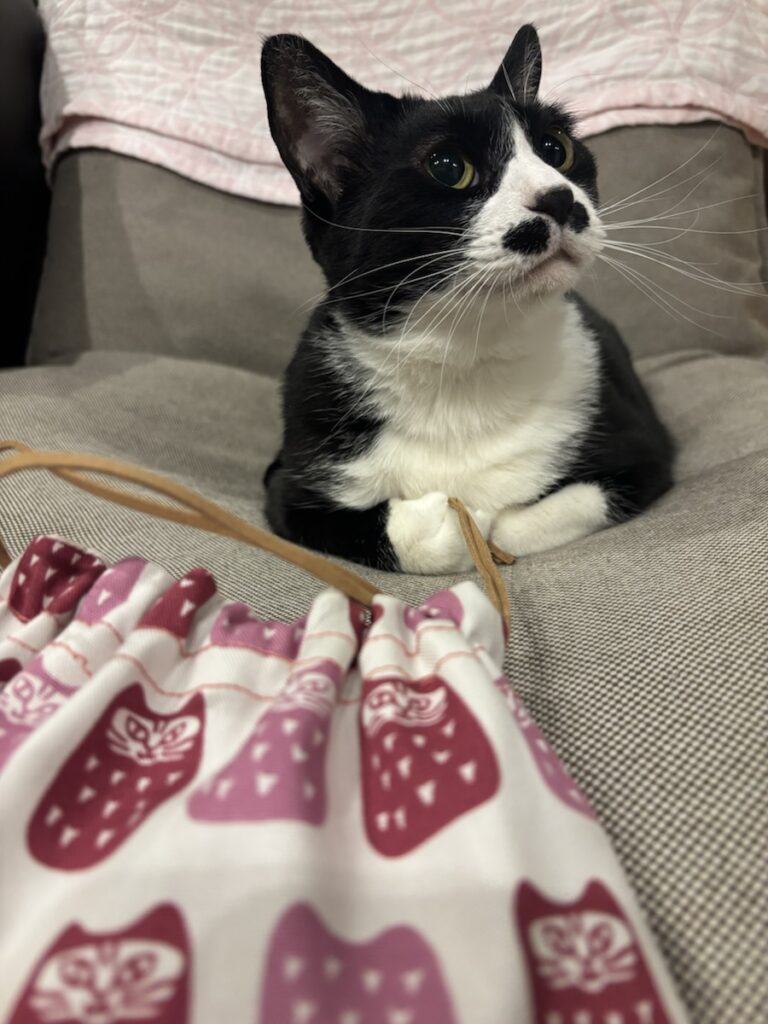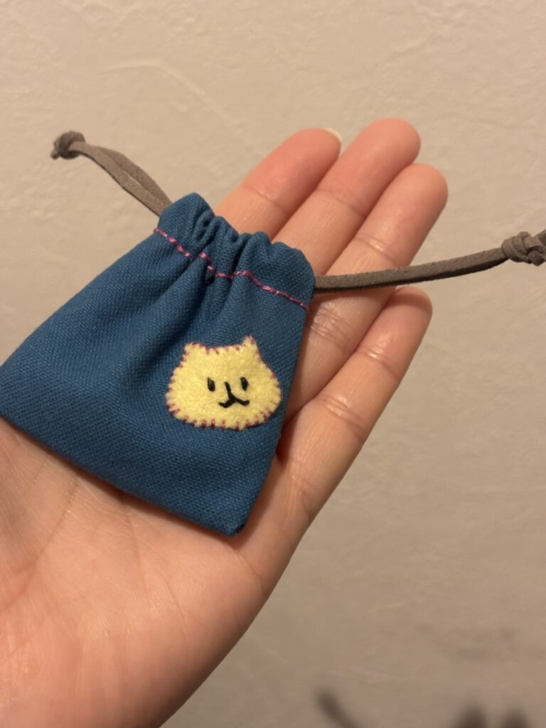 小袋の猫のワッペンの縫いつけ方を変えてみました。