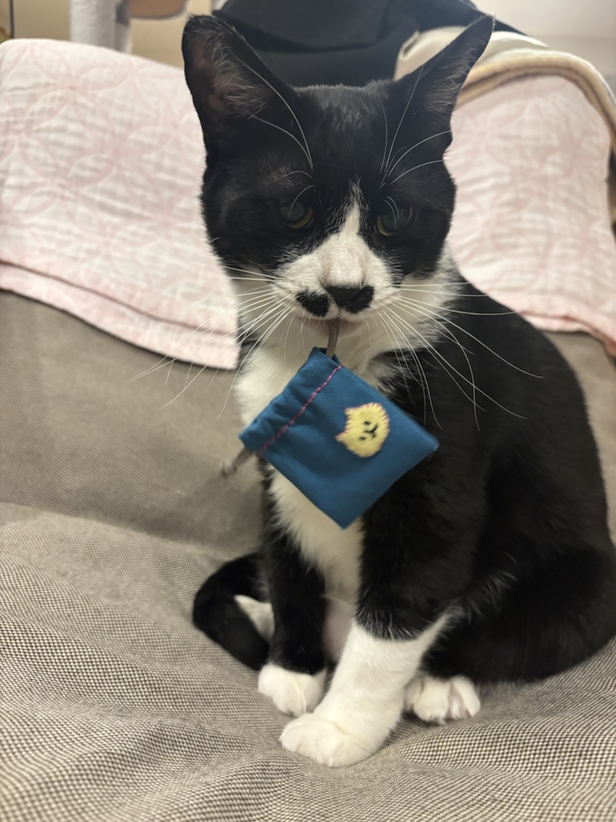 小袋の猫のワッペンの縫いつけ方を変えてみました。