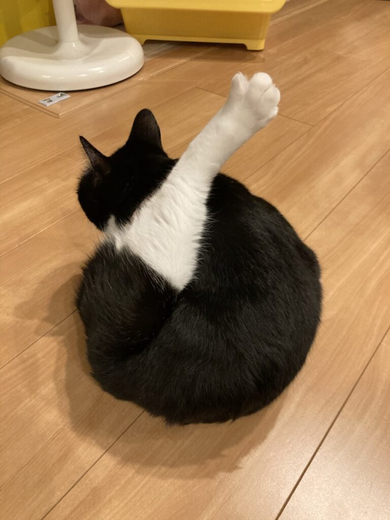 ワタシたち家族は、猫がこの姿勢で毛づくろいをしているのを『フライドチキンしてる』と呼んでいます。