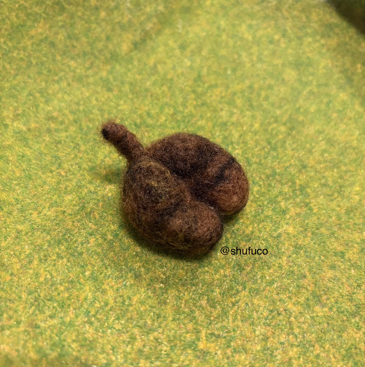 白で下地を固めて、茶色を全体にかぶせて、黒いラインを入れて、その上に黄色と茶色と黒色の羊毛をミックスしてからかぶせました。